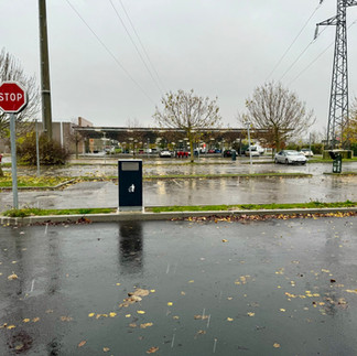 Tirsdag bød på mye regn gjennom hele Frankrike. Ladepausene ble i hovedsak tilbrakt innendørs, ofte i bilen. Kapteinens raggsokker med garn fra All you knit is love i Barcelona ble ferdige under ladepausen i Artenay, hvor det bøtta ned utenfor vinduene! 🌧️ Akkurat her var det tak over Tessie, og inne hadde vi det tørt og godt. 😊