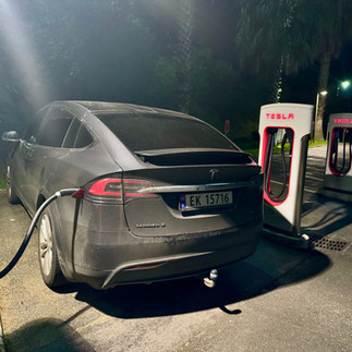 Så ble det mørkt, og vi kjørte over grensa til Frankrike. Grensene markeres gjerne med en bomstasjon, har vi lært så langt! 😊 Vi tok inn på et hotell like nord for Bordeaux, hvor Tessie samtidig fikk påfyll.